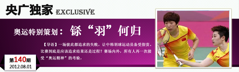 * 中國羽毛球頭號女雙組合“讓球”敗給韓國 現(xiàn)場遭噓 在31日的倫敦奧運(yùn)會羽毛球女雙小組賽A組最后一場比賽中,世界排名第一的中國組合于洋/王曉理以14:21和11:21爆冷不敵韓國組合鄭景銀/金荷娜,由于雙方在場上失誤頻頻,擊球不是出界就是下網(wǎng),比賽時(shí)溫布利體育館內(nèi)噓聲四起,F(xiàn)場的觀眾則很不理解:“雙方在國際水平以下,簡直是訓(xùn)練的水平,這對其他選手是不公平的。中國是體育大國,應(yīng)該給其他隊(duì)伍做個(gè)榜樣,在賽場上應(yīng)該代表中國的形象。” |