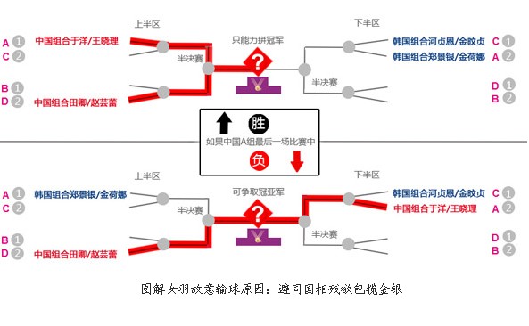 由于中國隊(duì)的另外一對組合田卿/趙蕓蕾以3戰(zhàn)2勝的成績奪取了小組賽D組第二的成績出線,所以他們淘汰賽中的第一個(gè)對手將是中華臺北的程文欣/簡毓瑾組合,如果能夠戰(zhàn)勝對手而進(jìn)入下一輪,那么他們將迎來A組第一名和D組第二名之間的勝者,也就是說,如果A組的中國選手于洋/王曉理今在今晚的比賽中戰(zhàn)勝韓國組合鄭景銀/金荷娜的話,那么于洋/王曉理將奪取A組小組第一的位置,這樣的話,這兩隊(duì)中國選手就等于說被分在了同一個(gè)半?yún)^(qū),也就是說在決賽之前中國隊(duì)將要提前“自相殘殺”