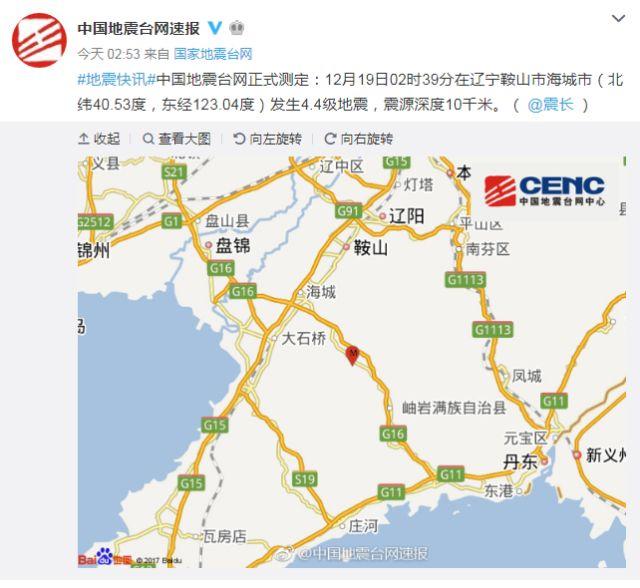 12月19日02時(shí)39分在遼寧鞍山市海城市(北緯40.53度,東經(jīng)123.04度)發(fā)生4.4級(jí)地震,震源深度10千米。