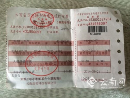 昆明北部汽車客運站副站長丁虎告訴記者:“不論是在客運站售票廳,還是在其他的車票代售處,昆明五個汽車客運站所用車票統(tǒng)一都是云南省國家稅務(wù)局通用機打發(fā)票,手寫車票絕對是假的!