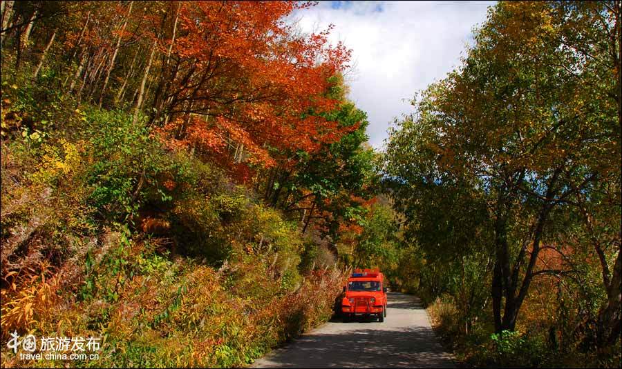 在藍(lán)天白云與青山綠水之間,山腳下的樹木花草還沉浸在夏日之中,然而自山頂向山腰已秋風(fēng)漸起,正悄悄地一層一層地變換著大山的衣著。楊、樺、胡枝子等由綠變黃綠、杏綠、最后變成黃色;楓、櫟、花楸、山葡萄則由綠變成鮮紅、橘紅、杏紅、醬紅……多情的金秋用赤、橙、黃、綠、青、藍(lán)、紫七色神筆把霧靈山描繪得色彩斑斕;紅的火熱,黃的真誠(chéng),綠的深沉,藍(lán)的純樸……霧靈秋色,層林盡染,構(gòu)成了一幅天然而美麗的畫卷。