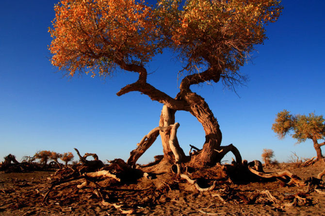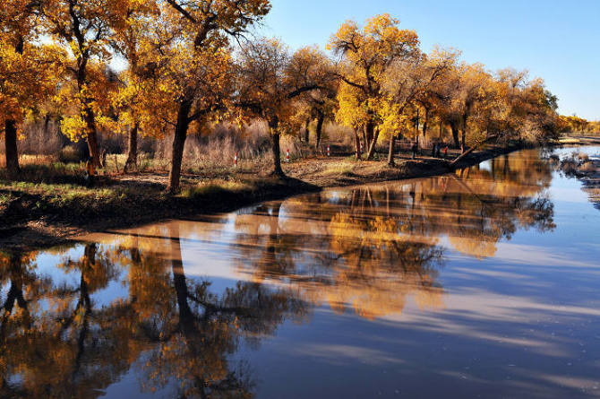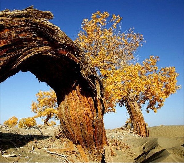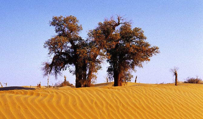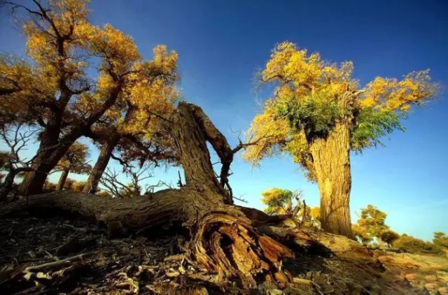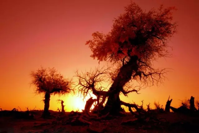 胡楊林是塔里木河流域典型的荒漠森林草甸植被類型,從上游河谷到下游河床均有分布。雖然胡楊林結構相對簡單,但具有很強的地帶性生態(tài)烙印。無論是朝霞映染,還是身披夕陽,它在給人以神秘感的同時,也讓人解讀到生機與希望。據有關資料顯示,人們還夸贊胡楊巨大的生命力是“三個一千年”,即活著一千年不死,死后一千年不倒,倒后一千年不朽。