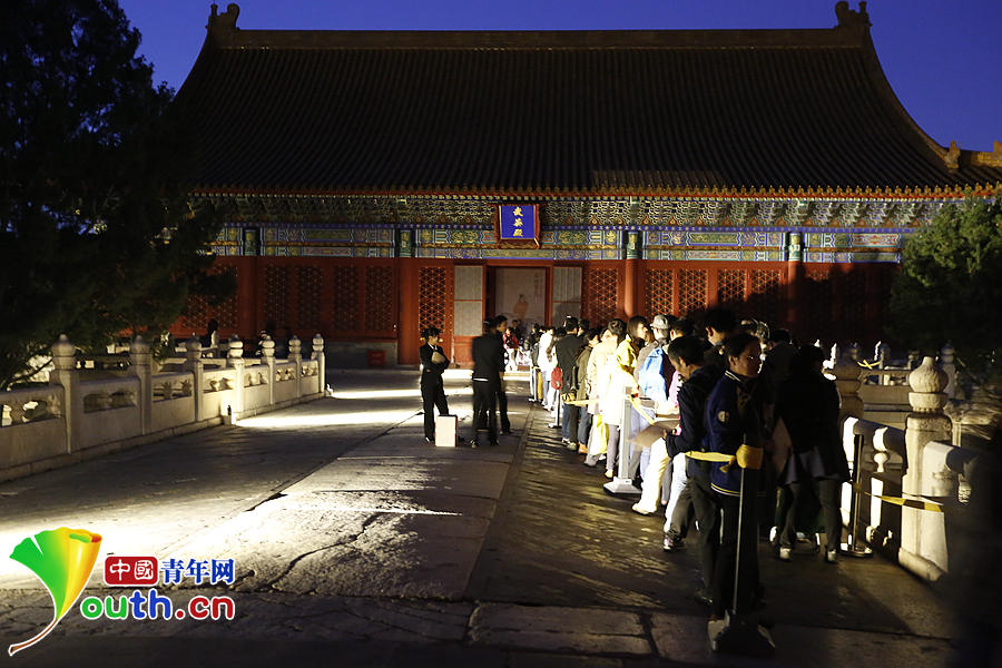 從9月8日開展以來,《石渠寶笈》特展異;鸨,觀眾排隊(duì)參觀到后半夜也時(shí)有發(fā)生。11日晚7時(shí)許,中國青年網(wǎng)記者在武英殿外見到了故宮博物院院長單霽翔。他告訴記者,“昨天排到凌晨兩點(diǎn)多,今天比昨天人數(shù)還要多得多,估計(jì)要得到三四點(diǎn)鐘才能結(jié)束!