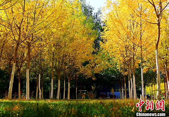 10月15日,進(jìn)入秋季以來(lái),在新疆托克遜縣的公園里,園內(nèi)的樹(shù)林已經(jīng)褪去綠色,披上了黃色外衣,在陽(yáng)光的照射下尤為光彩奪目,秋景迷人如畫(huà)。每年秋天,隨意走在托克遜的大街小巷、鄉(xiāng)村小道,隨處可欣賞到托克遜秋天的美麗景色。