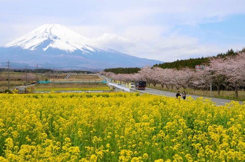 日本富士山下油菜花悉數綻放 與櫻花交相輝映(圖)