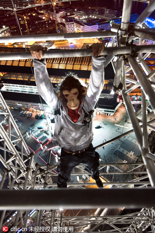 2016年4月21日?qǐng)?bào)道(具體拍攝時(shí)間不詳),德國(guó)科隆,這些令人心跳加速的照片顯示,一名男子懸蕩在科隆一座大教堂的邊緣。同樣膽大的攝影師Flavius Vesely為他的面具朋友Flavius拍攝下了這些驚險(xiǎn)的照片。其中一張顯示Flavius戴著猴子面具懸掛在環(huán)繞教堂的腳手架上,看上去令人心驚肉跳。Flavius來自德國(guó)卡塞爾,是“視覺仇敵'組織的一名成員(Visual Enemies),該組織是一個(gè)城市團(tuán)體,由攀爬者和攝影師組成。Flavius Vesely/東方IC
