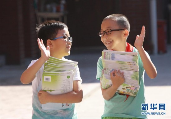 8月31日,在江蘇省無(wú)錫市揚(yáng)名中心小學(xué),兩名同學(xué)在領(lǐng)取新學(xué)期教材。新學(xué)期,每個(gè)學(xué)生感受都不同,有初來(lái)乍到的新奇,有早起上課的困倦,有與小伙伴重逢的喜悅,也有與家人短暫離別的不舍……開(kāi)學(xué)的表情,豐富多彩。新華社發(fā)(湯毅攝)