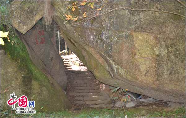 只見梅屋門前(洞口),松竹哨兵左右列隊(duì),菩提滄桑,兩巨大巍峨的石頭“人”字相靠支撐起一個(gè)約有20平米的通透大洞竇。下三四石階,進(jìn)到洞里,涼氣逼人。洞里左邊靠洞壁處有方便探幽尋訪者休憩的石塊。偶見丟棄的飲料瓶蓋等給人感覺這里不缺少生活氣息。直行出洞,石條小橋橫跨溪流,天地豁然開闊,天造地設(shè),修身養(yǎng)性絕佳去處。