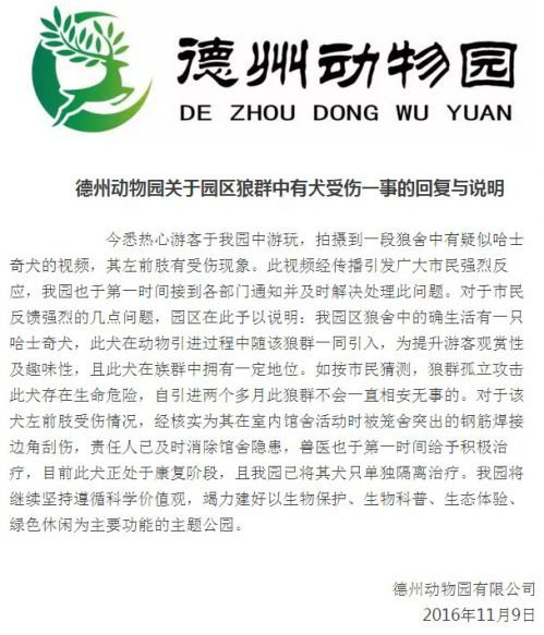 德州動物園方面一夏姓經(jīng)理表示:受傷是因為狗在室內(nèi)館舍活動時被籠舍突出的鋼筋焊接邊角刮傷 , 目前已消除館舍隱患,獸醫(yī)也于第一時間給予積極治療,目前此犬正處于康復(fù)階段。夏經(jīng)理稱現(xiàn)在園方已經(jīng)將狗與狼分開飼養(yǎng)。