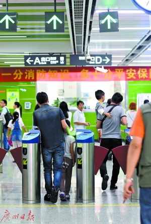 家長帶著兒童進(jìn)地鐵閘口。
