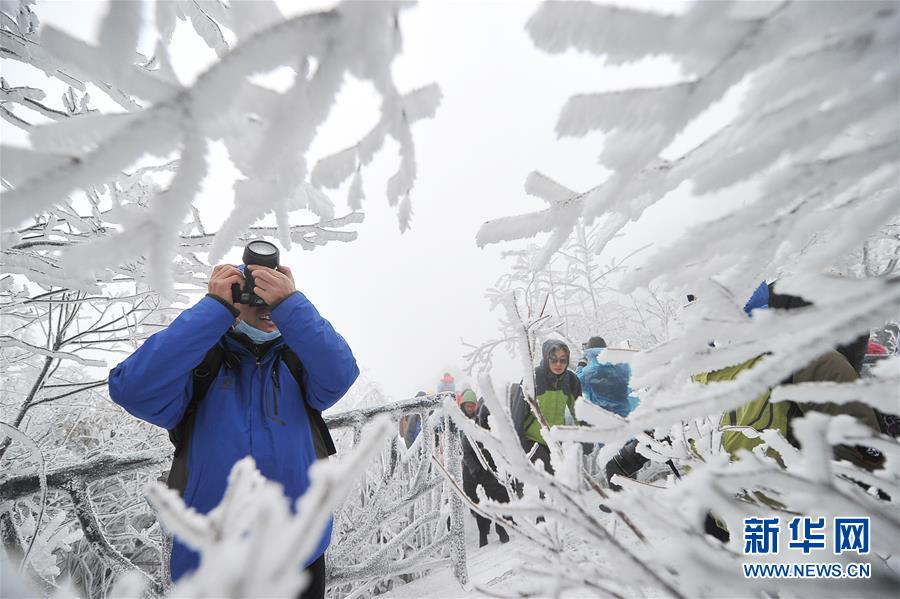 11月23日,游客在湖南張家界天門山景區(qū)拍攝霧凇。當(dāng)日,受大幅降溫天氣影響,我國多地出現(xiàn)霧凇景觀,令游客流連忘返。 新華社發(fā)(邵穎 攝)