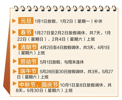 通知說,經(jīng)國務(wù)院批準(zhǔn),2017年元旦、春節(jié)、清明節(jié)、勞動(dòng)節(jié)、端午節(jié)、中秋節(jié)和國慶節(jié)放假調(diào)休日期的具體安排如下(見下圖)。