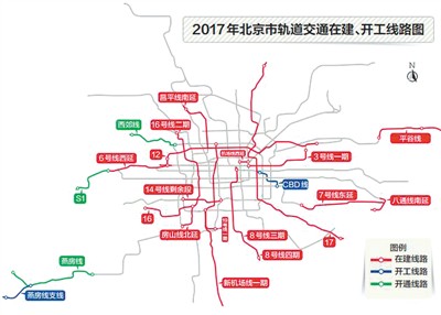 數(shù)據(jù)顯示,2017年,北京市在建軌道線將超過350公里,線路之多、建設(shè)規(guī)模之巨再創(chuàng)歷史紀(jì)錄。今年在建的20條線路分別是16號(hào)線、16號(hào)線二期西苑至蘇州街段、S1線、西郊線、燕房線、新機(jī)場線一期、12號(hào)線、17號(hào)線、19號(hào)線一期、6號(hào)線西延、7號(hào)線東延、8號(hào)線三期、8號(hào)線四期、3號(hào)線一期、14號(hào)線剩余段、房山線北延、機(jī)場線西延、平谷線、八通線南延和昌平線南延一期。