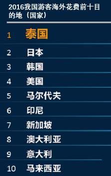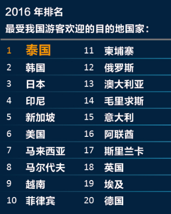 報告根據(jù)在線預訂數(shù)據(jù),發(fā)布了2016 年最受中國游客歡迎的二十大目的地國家,依次是:泰國、韓國、日本、印尼、新加坡、美國、馬來西亞、馬爾代夫、越南、菲律賓、柬埔寨、俄羅斯、澳大利亞、毛里求斯、意大利、阿聯(lián)酋、斯里蘭卡、英國、埃及和德國。