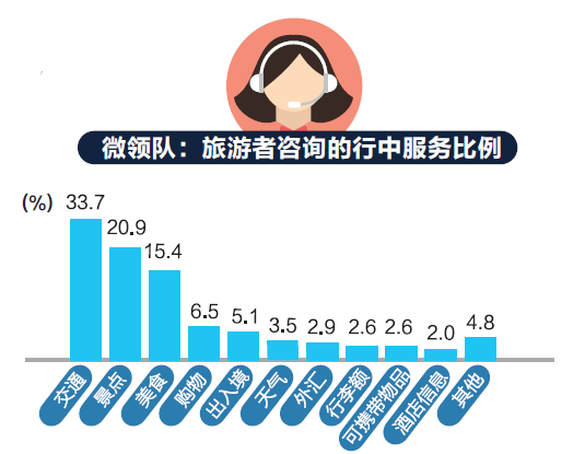中國出境旅游者最需要哪些服務?據(jù)攜程“微領隊”全年大數(shù)據(jù)統(tǒng)計,用戶咨詢求助的問題一共有16類,包括旅游生活的各個方面,其中最多的是:交通33.7%、景點20.9%、美食15.4%、購物6.5%、出入境5.1%、天氣3.5%、外匯相關2.9%等。