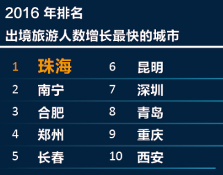 2016 年排名前20 位的出境旅游出發(fā)城市為:上海、北京、深圳、廣州、杭州、成都、南京、天津、武漢、重慶、廈門、西安、長沙、昆明、青島、沈陽、寧波、鄭州、南寧、大連。出境旅游人數(shù)增長速度最快的前10 名城市分別為珠海、南寧、合肥、鄭州、長春、昆明、深圳、青島、重慶、西安。