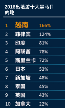 2016年,部分目的地成為出境游黑馬,對我國游客的吸引力顯著提升。根據(jù)網上報名人數(shù),報告發(fā)布了游客量增長最快的前十大人氣目的地,依次是:越南、菲律賓、印度、阿聯(lián)酋、斯里蘭卡、日本、新加坡、泰國、英國、加拿大。簽證放寬成為這些國家上升為黑馬的主要原因,由于采取了對中國游客更優(yōu)惠的簽證政策,游客增長最高的超過100%以上。