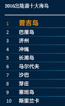 受國內霧霾、空氣污染以及國人度假需求上升影響,空氣質量和自然環(huán)境成為我國游客選擇目的地的重要因素。空氣清新,陽光燦爛的海島越來越受到中國游客的青睞。海島游占出境游總人數(shù)的30%。從攜程度假的訂單看,2016年十大人氣海島包括:普吉島、巴厘島、濟州島、沖繩、長灘島、馬爾代夫、沙巴、芽莊、塞班島、斯里蘭卡。