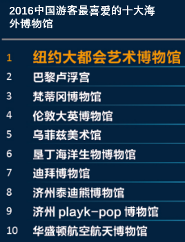 除了觀光、購物,中國游客對各國文化藝術也越來越有興趣,興起了一股“博物館熱”。根據(jù)攜程當?shù)赝鏄奉A訂數(shù)據(jù),報告發(fā)布了2016年最受中國游客歡迎的全球10大博物館,紐約大都會藝術博物館、巴黎盧浮宮、梵蒂岡博物館、倫敦大英博物館等排名領先。
