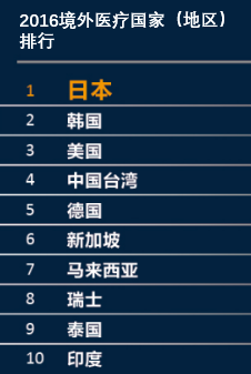 境外醫(yī)療成為繼“出國爆買”之后我國游客的新風尚。我國大量富裕階層不惜花費重金選擇境外醫(yī)療旅游。2016年通過攜程報名參加出境體檢等醫(yī)療旅游人數(shù)是前一年的5倍,人均訂單費用超過5萬元。根據(jù)網上預訂與瀏覽數(shù)據(jù),報告發(fā)布了海外醫(yī)療旅游最受歡迎的10大目的地國家和地區(qū)是:日本、韓國、美國、中國臺灣、德國、新加坡、馬來西亞、瑞士、泰國、印度。