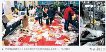 “濟(jì)州機(jī)場(chǎng)的中國(guó)游客所過之處一片狼藉”,韓國(guó)《朝鮮日?qǐng)?bào)》15日以此為題報(bào)道稱,濟(jì)州市民盧某12日在“臉譜”上發(fā)文稱:“中國(guó)人瘋狂地撕掉免稅品的包裝,清潔員們默默地把這些包裝在一邊堆成小山一樣。這筆(清理)垃圾的費(fèi)用應(yīng)該也是由市民們負(fù)擔(dān)的,我第一次覺得有必要收取(游客的)入島費(fèi)”。