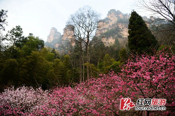 黃石寨梅園位于張家界黃石寨索道下站至老磨彎廣場路段,入春以來隨著氣溫的升高,5000株梅樹競相綻放著粉紅、淺白、淡黃多種顏色的花朵,千姿百態(tài),芳香迷人,向中外游客傳遞著張家界春天的氣息。