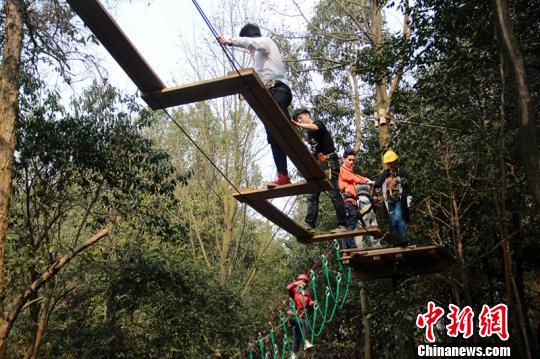 3月8日,游客正在體驗(yàn)剛開放的飛越叢林樹上探險項(xiàng)目。經(jīng)過兩年的建設(shè)籌備與試營運(yùn),長沙飛越叢林戶外冒險樂園將于3月15日在湖南長沙大明山莊正式開園。據(jù)了解,這是“飛越叢林”繼福州、重慶、成都之后中國第四家,也是華中地區(qū)首家叢林冒險樂園。