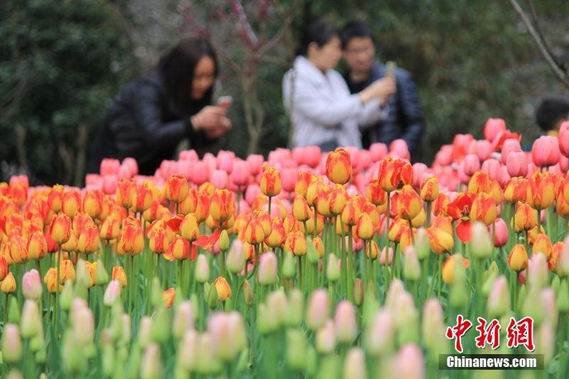 3月中旬,湖南張家界老道灣度假景區(qū)50多個品種、近50萬株的郁金香爭相綻放,每天吸引萬余游客前來賞花踏春,整個花期將一直持續(xù)到5月份。 甘惠江 攝
