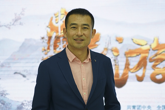 舞臺(tái)上舉著導(dǎo)游旗講解的劉凱。實(shí)習(xí)生王趙童 攝