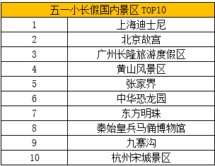 五一出游,哪些景區(qū)最受游客喜愛?攜程大數(shù)據(jù)顯示,截至目前,在五一小長假十大熱門景區(qū)排行中,包括上海迪士尼、北京故宮、廣州長隆旅游度假區(qū)、黃山風(fēng)景區(qū)、張家界、中華恐龍園、東方明珠、秦始皇兵馬俑博物館、九寨溝、杭州宋城景區(qū)等在內(nèi)的十個(gè)景區(qū)上榜。