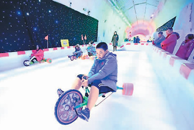 在山西省忻州市蘆芽山人造冰洞內(nèi),人們身著厚厚的棉服游玩避暑。