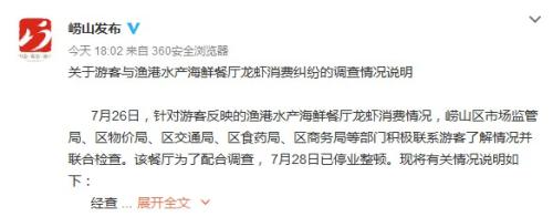 7月26日,針對(duì)游客反映的漁港水產(chǎn)海鮮餐廳龍蝦消費(fèi)情況,嶗山區(qū)市場(chǎng)監(jiān)管局、區(qū)物價(jià)局、區(qū)交通局、區(qū)食藥局、區(qū)商務(wù)局等部門(mén)積極聯(lián)系游客了解情況并聯(lián)合檢查。該餐廳為了配合調(diào)查,7月28日已停業(yè)整頓。有關(guān)情況說(shuō)明如下: