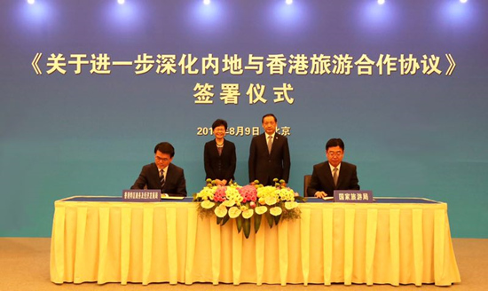 會(huì)見(jiàn)后,在李金早和林鄭月娥共同見(jiàn)證下,國(guó)家旅游局與香港特區(qū)商務(wù)及經(jīng)濟(jì)發(fā)展局在京簽署《關(guān)于進(jìn)一步深化內(nèi)地與香港旅游合作協(xié)議》。