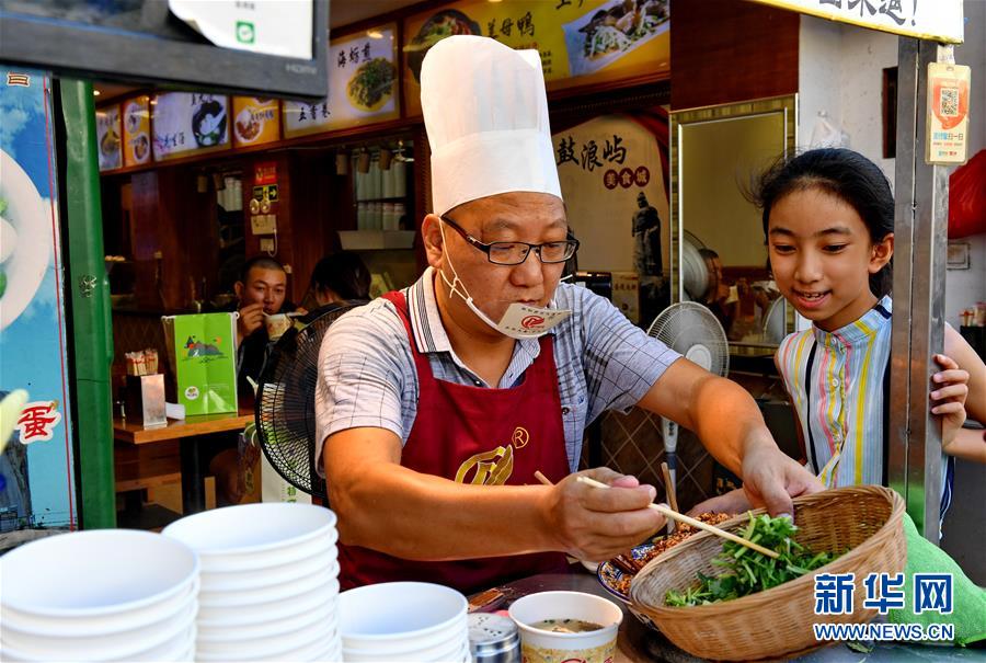 一名小游客在鼓浪嶼街邊商鋪觀看廈門(mén)小吃制作(8月29日攝)。被列入世界文化遺產(chǎn)名錄的廈門(mén)鼓浪嶼以其風(fēng)格迥異、中西合璧的建筑,富有特色的商鋪吸引了四面八方的游客。 新華社記者 張國(guó)俊 攝 -