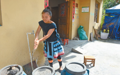 謝三英在新居用自來水洗手。