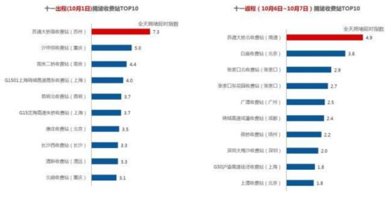出返程易擁堵收費(fèi)站中,10月1日為高速出程高峰,蘇州蘇通大橋南收費(fèi)站擁堵程度最高,其次為重慶沙坪壩收費(fèi)站;10月6日至7日返程車流較分散,收費(fèi)站周邊擁堵程度普遍要低于10月1日,其中最擁堵的收費(fèi)站為南通的蘇通大橋北收費(fèi)站。