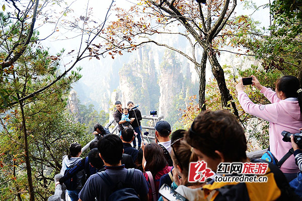 紅網(wǎng)時刻10月30日訊(通訊員 鄧道理)金秋武陵源,美景惹人羨。十月將盡。世界自然遺產(chǎn)地張家界武陵源風(fēng)景名勝區(qū)天子山、袁家界、黃石寨一帶深秋風(fēng)景異常迷人,紅的、黃的、紫的、綠的樹葉把一座座山峰裝扮得五彩斑斕,恍若童話世界,令海內(nèi)外游客陶醉忘返。