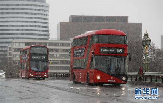 12月10日,在英國(guó)倫敦,紅色雙層巴士在雪中行駛。 新華社記者韓巖 攝
