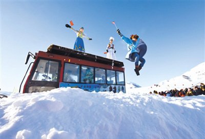 1月1日,在新疆喀納斯禾木村舉辦的潑雪節(jié)上,當地居民在為游客表演跳雪。