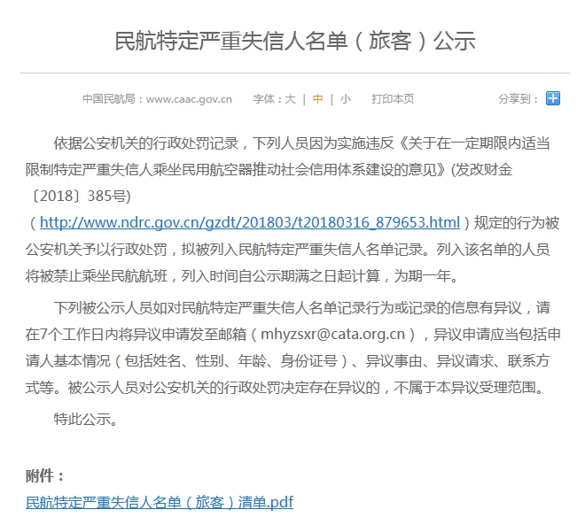 根據(jù)公告信息,列入該名單的人員將被禁止乘坐民航航班,列入時(shí)間自公示期滿之日起計(jì)算,為期一年。被公示人員如對(duì)民航特定嚴(yán)重失信人名單記錄行為或記錄的信息有異議,可在7個(gè)工作日內(nèi)提出異議申請(qǐng)。但被公示人員對(duì)公安機(jī)關(guān)的行政處罰決定存在異議的,不屬于本異議受理范圍。