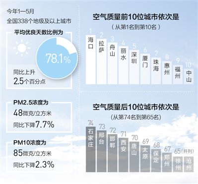 生態(tài)環(huán)境部日前發(fā)布今年前5月全國城市空氣質(zhì)量狀況,1—5月,全國338個(gè)地級(jí)及以上城市平均優(yōu)良天數(shù)比例為78.1%,同比上升2.5個(gè)百分點(diǎn)。PM2.5濃度為48微克/立方米,同比下降7.7%;PM10濃度為85微克/立方米,同比下降2.3%。