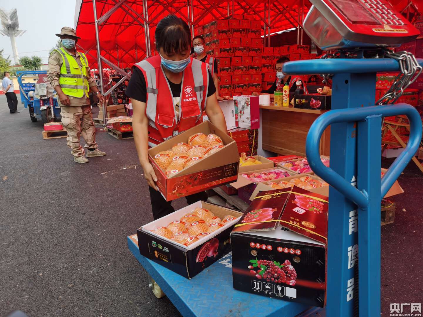 。新發(fā)地水果區(qū),賣石榴的批發(fā)商戶正在整理貨物。實習記者王紅霞 攝。)