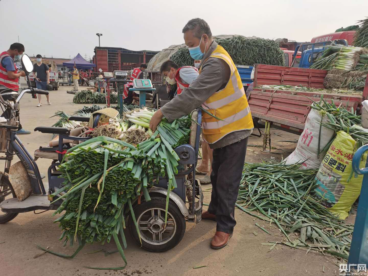 。蔬菜交易區(qū),大蔥商戶正在整理貨物。實習記者王紅霞 攝。)