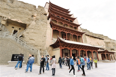 自2016年首屆絲綢之路(敦煌)國際文化博覽會在甘肅敦煌成功舉辦以來,敦煌受到越來越多的關(guān)注。敦煌借此機(jī)遇,推出多項旅游優(yōu)惠政策。據(jù)統(tǒng)計,僅今年第一季度,敦煌市旅游接待量就達(dá)113萬人次,總收入達(dá)11億元,分別增長20%和21.5%。上圖為游客在敦煌莫高窟參觀九層樓。