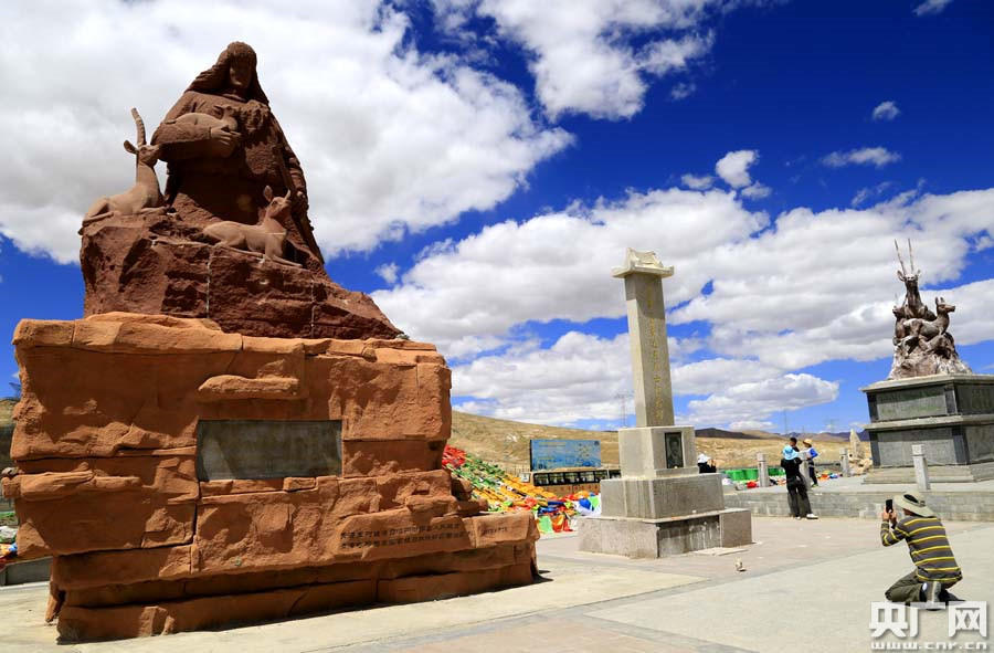 游客在昆侖山口的可可西里自然保護區(qū)藏羚羊雕塑前留影(央廣網記者 張雷 攝)