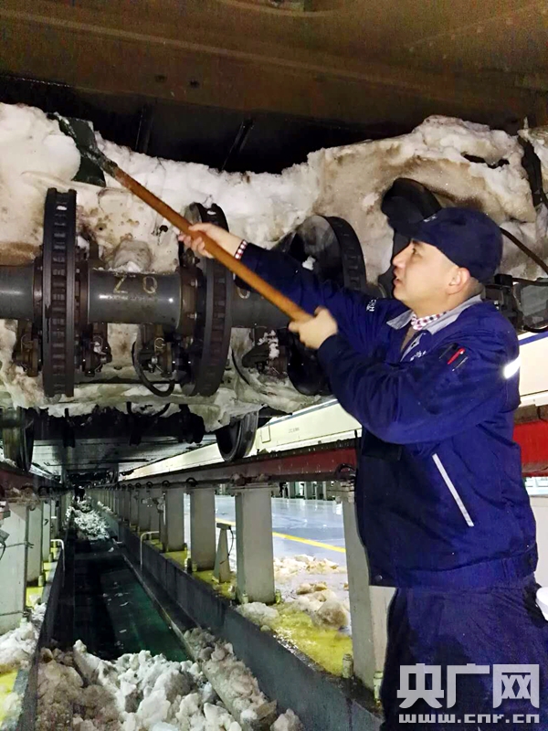 2018年1月4日 中國(guó)鐵路北京局集團(tuán)公司北京動(dòng)車段,職工正在進(jìn)行動(dòng)車組列車底部的掃雪除冰作用。(央廣網(wǎng)發(fā) 高悅攝)