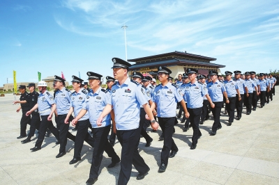 9月2日下午,酒泉市舉行了全市公安機(jī)關(guān)安保誓師大會(huì)。圖為公安干警邁著整齊的步伐走過敦煌國際會(huì)展中心廣場(chǎng)。通訊員鄒凱強(qiáng)