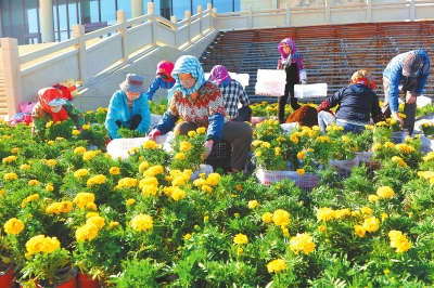 工作人員在敦煌國際會(huì)展中心外圍擺放花卉,營造美麗環(huán)境。