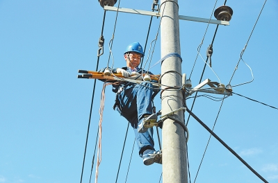 為做好第二屆敦煌文博會(huì)期間的電力保障,國網(wǎng)甘肅電力公司和嘉峪關(guān)、酒泉供電公司及酒泉7縣市區(qū)骨干力量,深入開展護(hù)網(wǎng)專項(xiàng)行動(dòng)。圖為9月6日,敦煌市月牙泉鎮(zhèn)合水村,國網(wǎng)肅北供電公司的檢修員寧生海正在十幾米高的電線桿頂部掛接地線。通訊員楊夏茹