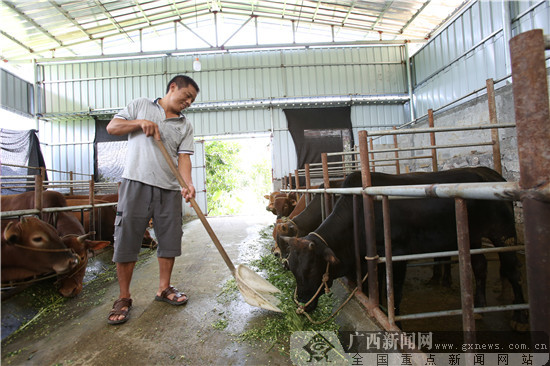 環(huán)江毛南族自治縣下南鄉(xiāng)下南社區(qū)上里屯村民譚夢(mèng)強(qiáng)在自家牛棚。廣西新聞網(wǎng)記者 林亮攝